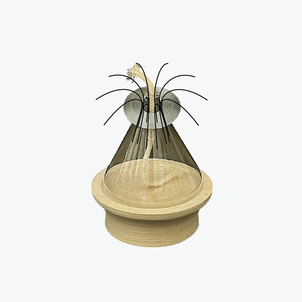Focusing on five natural elements, I selected plants, candles, and wind chimes to serve as the foundation of this concept. The collection comprises three objects: a moss pot, an oil candle, and a wooden wind chime. Each item is designed with sustainability in mind, using natural materials like glass and wood, handcrafted at the Brooklyn Glass Workshop and shaped with woodworking tools such as the lathe.
